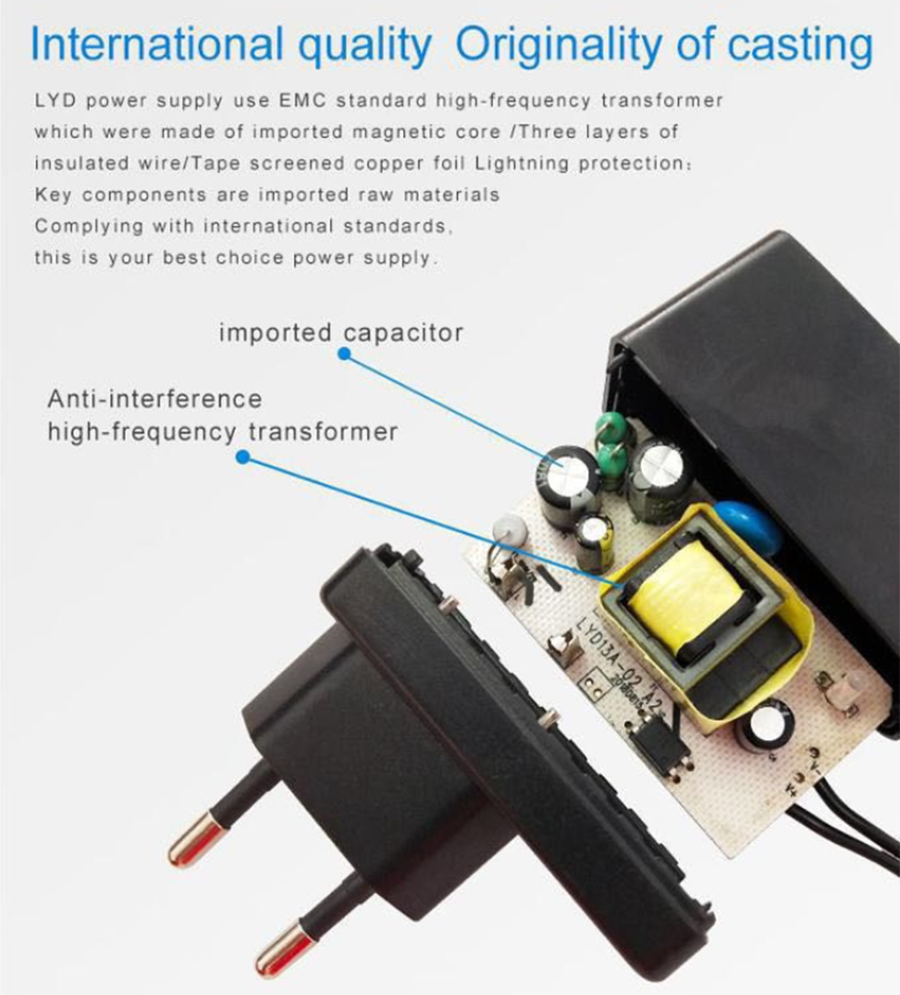 Interchangeable wall plug power adapter for worldwide use, UK EU AU US EK plugs are available for your selection.
